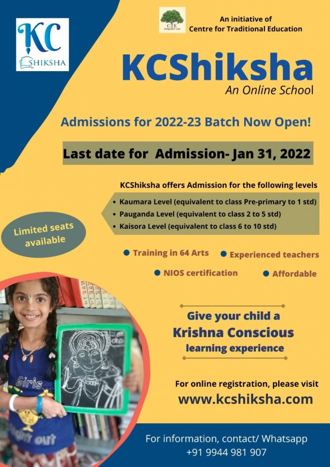 Hare Krishna! “KCShiksha Blended School” is NOW opening for CST time zone (for students from the US, Canada, etc)! KCShiksha imparts a curriculum that is both culturally rich and academically practical. We give equal importance to all the areas of education for a holistic child upbringing. Ideal for homeschoolers, seekers of alternative education rooted in…