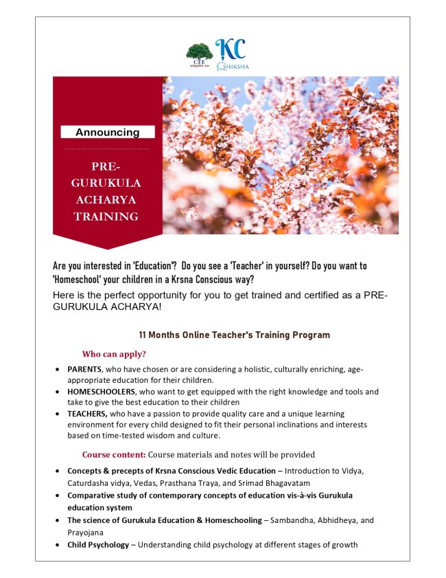 *Announcing Pre- Gurukula Acharya Training* Are you interested in ‘Education’? Do you see a ‘Teacher’ in yourself? Do you want to ‘Homeschool’ your children in a Krsna Conscious way? Here is the perfect opportunity for you to get trained and certified as a PRE-GURUKULA ACHARYA! 11 Months Online Teacher’s Training Program Who can apply? •…