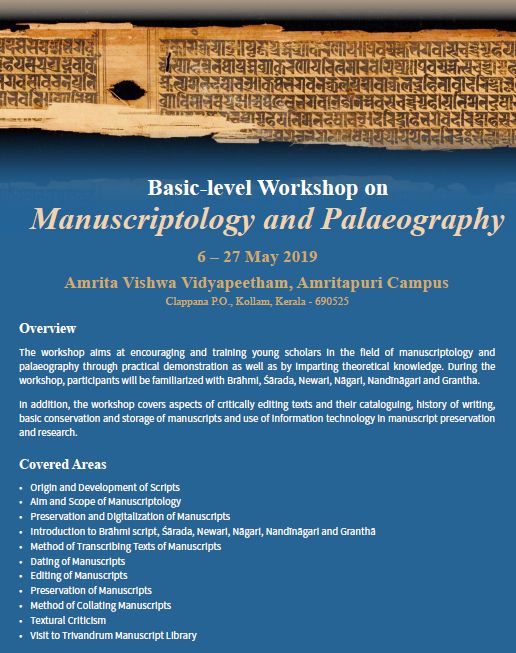 A Basic-level Workshop on Manuscriptology and Palaeography (21 days) is being organized by Amrita Darshanam, International Centre for Spiritual Studies (ICSS), Amrita Vishwa Vidyapeetham, in collaboration with the National Mission for Manuscripts (NAMAMI), Govt. of India, from 6 to 27 May 2019. The workshop aims at encouraging and training young scholars in the field of…
