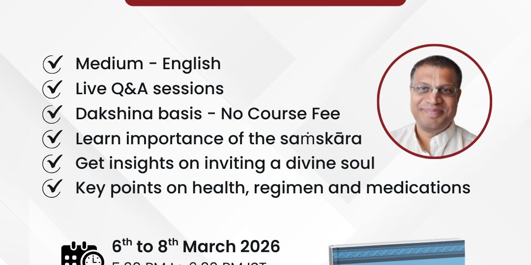 We are pleased to invite you to the Garbhādhāna Saṁskāra Course conducted by HG Bharat Chandra Dāsa, from 6th to 8th March 2026, 5:30 PM to 6:30 PM IST.